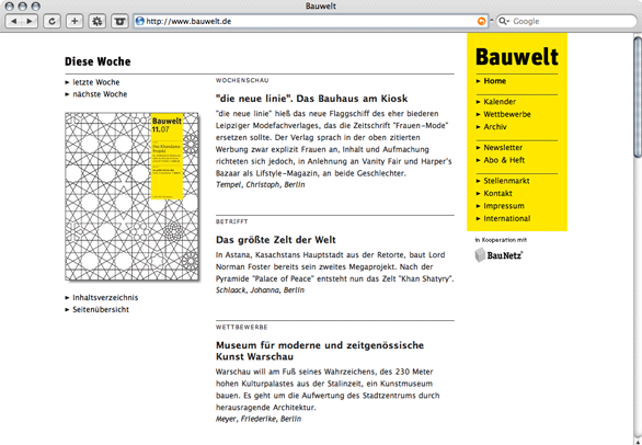 Bauwelt is the chief opinion leader among German architectural magazines. It is current, highly esteemed, self conscious, elitist, critical, intellectual, strict, purist, pithy - and its design was somewhat long in the tooth.