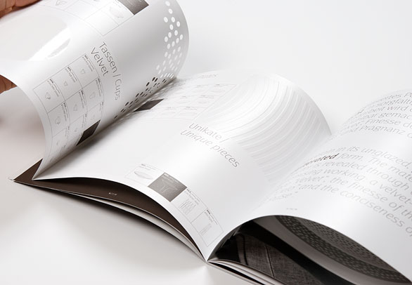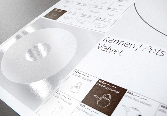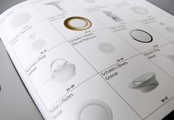 We developed a concept for the general catalogue and the image brochure, the first objects to appear within the new corporate design system. The challenge lay in making the enormous diversity of the porcelain collection and the complexity of its shapes and decor understandable without representing them as a dry piece of printed paper, but rather as an exciting object. Each part of the collection has its own page in this 704-page book. The image brochure with its blind embossing, perforations, glossy varnish and metallic inks looks as much like porcelain as anything made of paper possibly can.